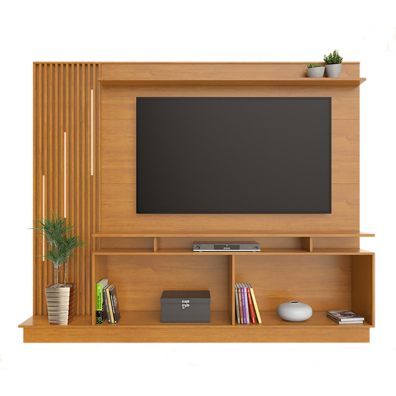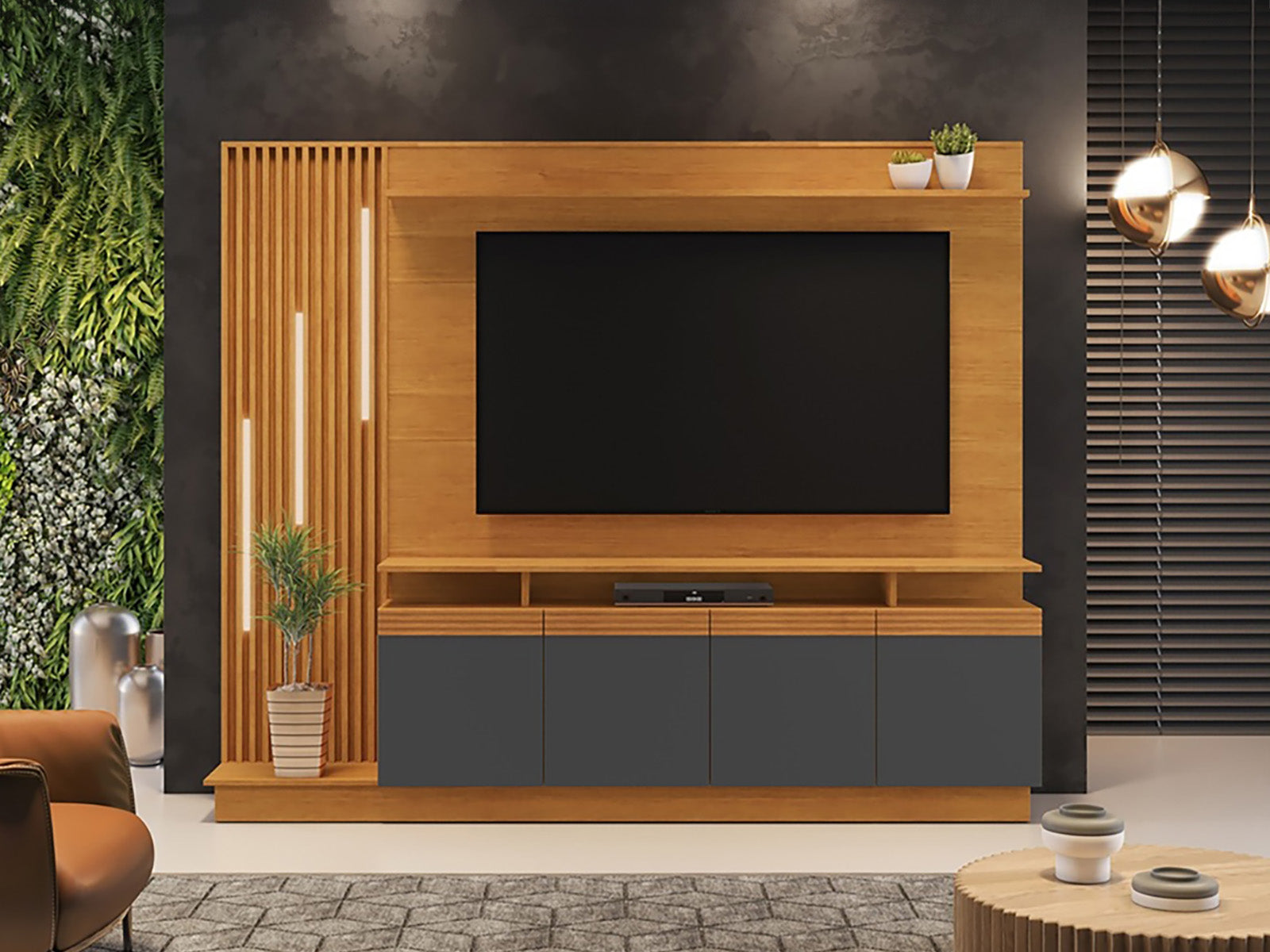 Centro de entretenimiento imponente con amplio espacio para TV, estantes y módulos decorativos. Su diseño moderno combina perfecto en cualquier espacio.