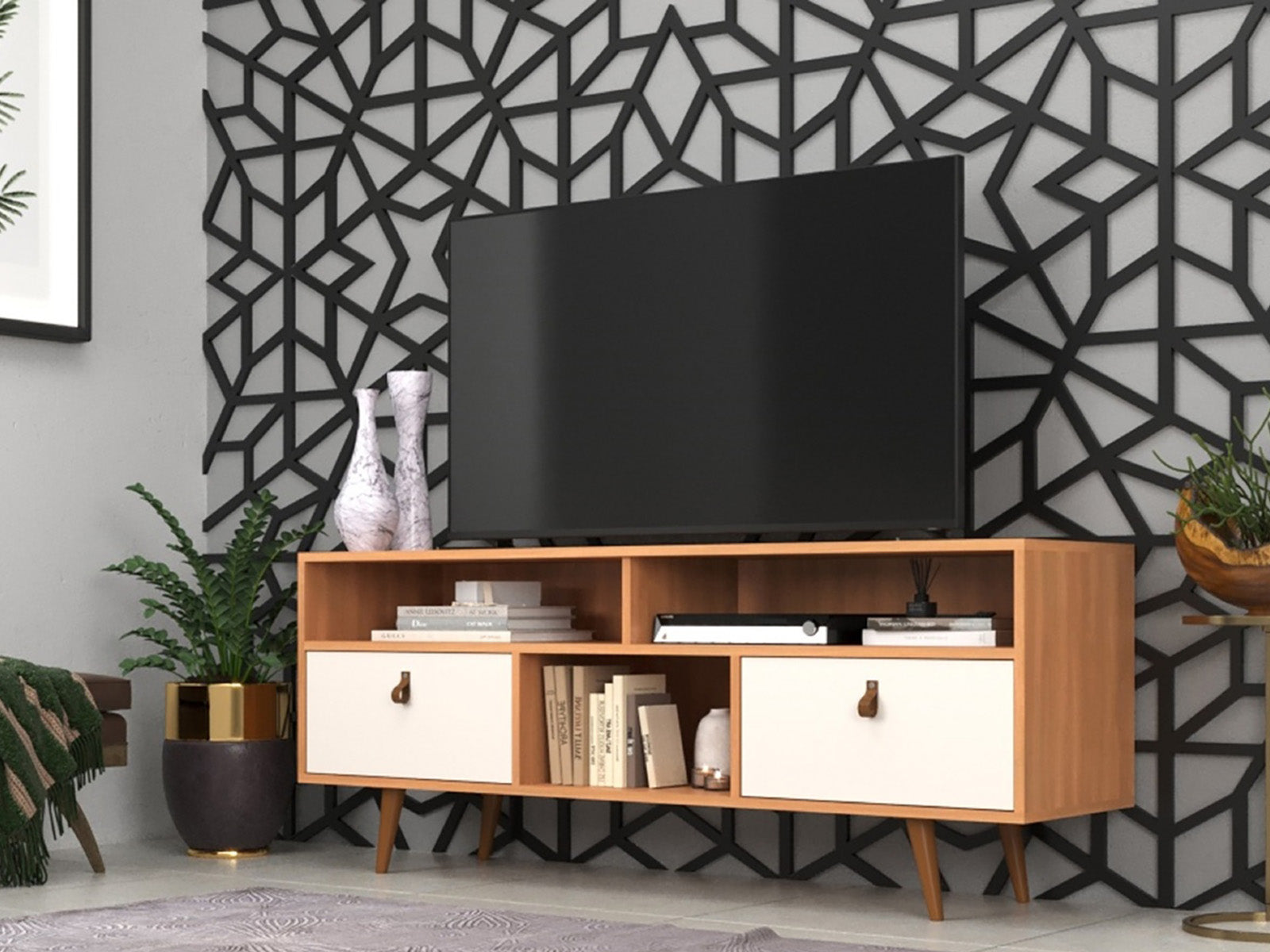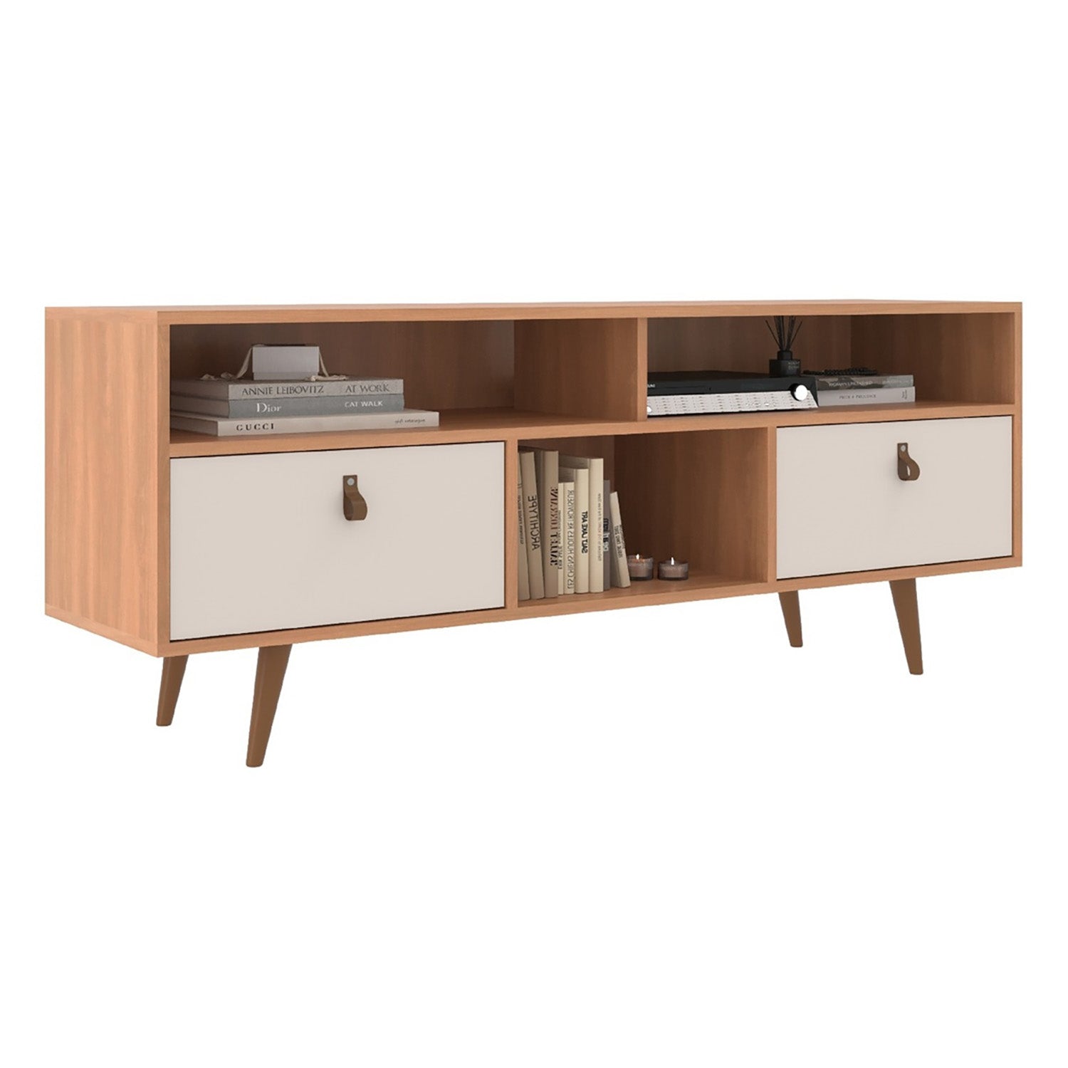 Mueble de estilo escandinavo en color freijó/off white, cuenta con dos cajones espaciosos y compartimentos abiertos. Ideal para mantener ordenado el living o sala de estar.